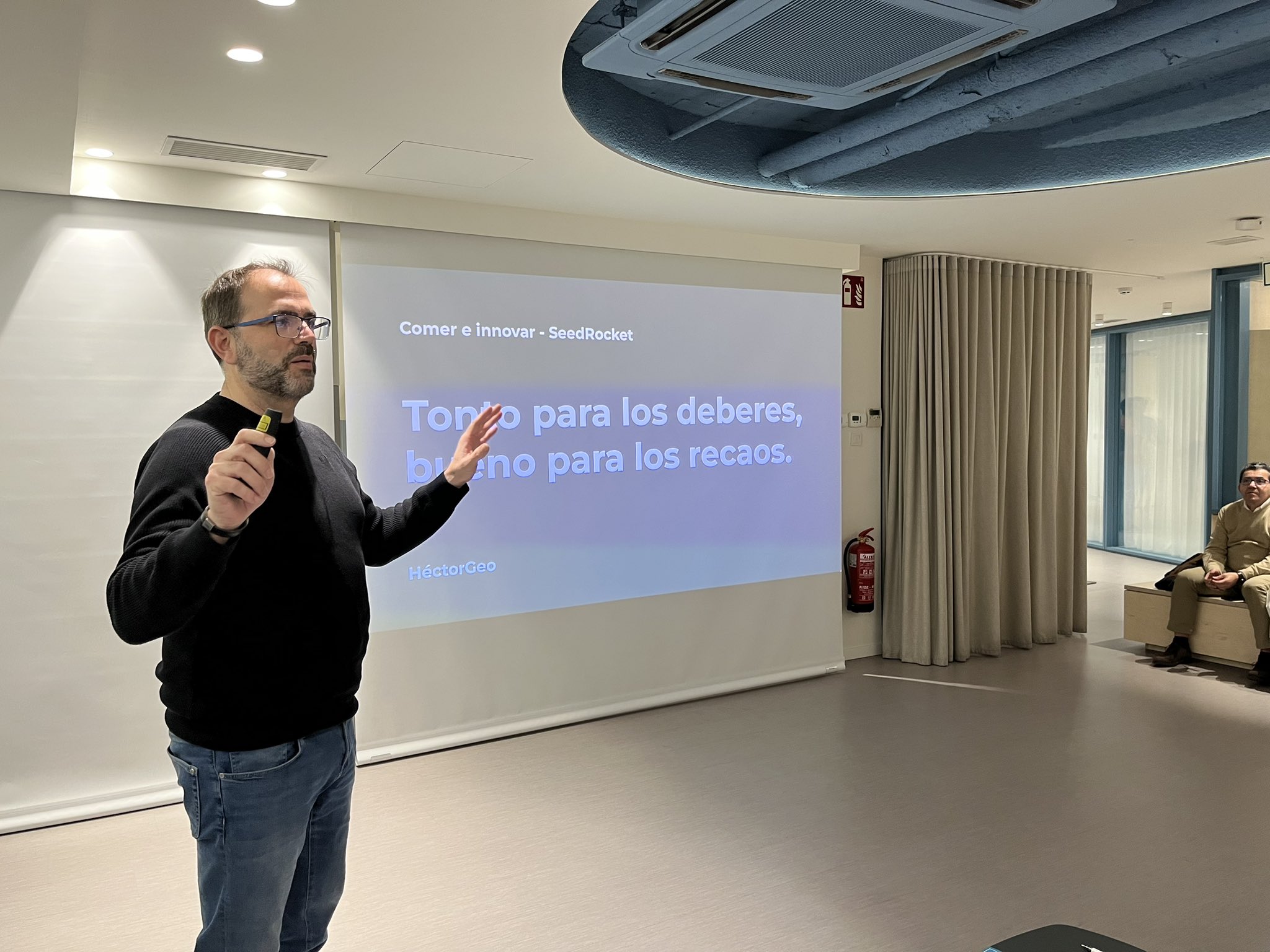 Una vez finalizadas las presentaciones, tuvimos ocasión de escuchar la inspiradora ponencia «Comer e innovar» de la mano de Héctor García, Fundador y CEO de Geographica – Now a CARTO company, mentor de SeedRocket e inversor. Héctor habló sobre su experiencia profesional, destacando alguna de las claves para lograr el éxito y animando a los/as asistentes a explotar sus cualidades más diferenciales, que son sin duda su valor añadido.